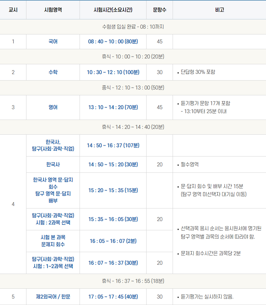 ※시험당일 모든 수험생은 08:10까지 지정된 시험실 또는 대기장소에 입실해야 하며, 2교시 ~ 5교시는 시험 시작 10분전까지 입실해야 합니다.